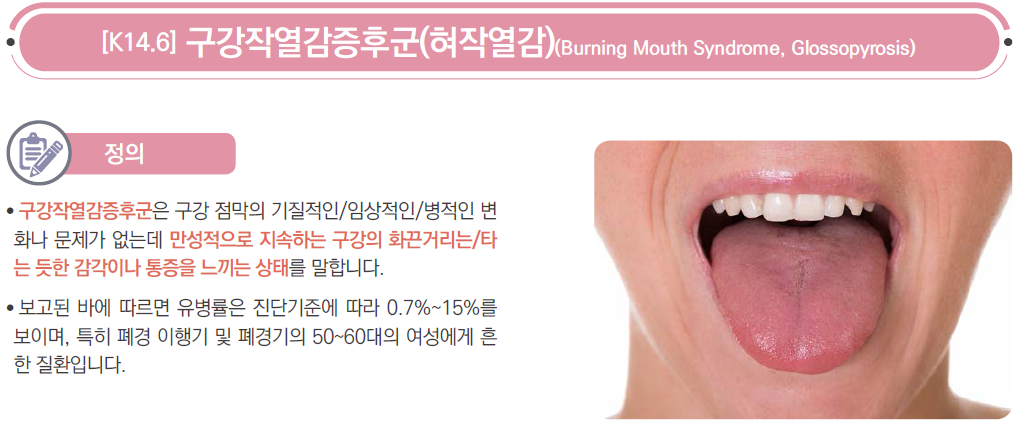 - 구강작열감증후군은 수 개월 이상 매일 발생할 수 있는 입안에서 느껴지는 통증(작열감)입니다.
