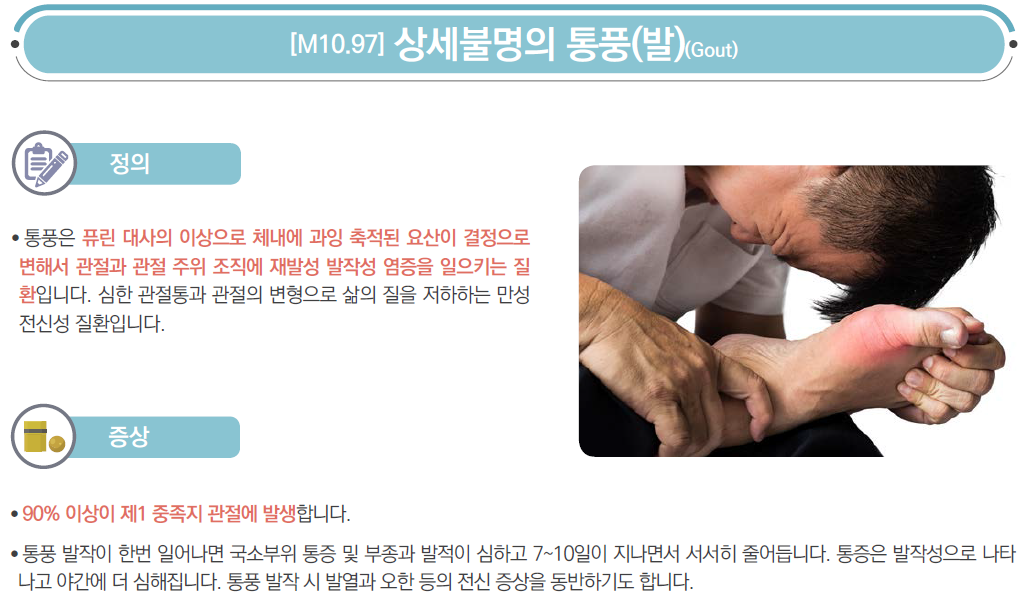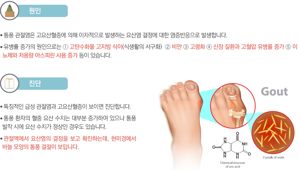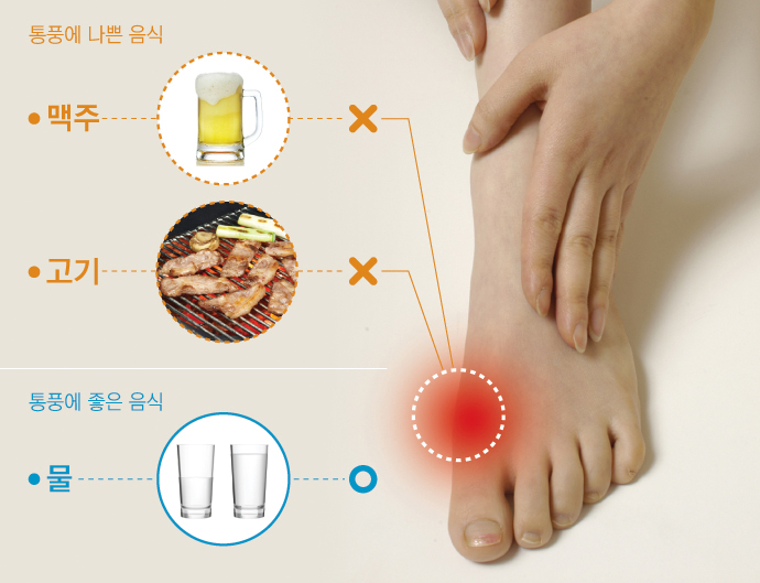 통풍은 요산이라는 물질이 몸밖으로 빠져나가지 못하고 과도하게 축적되어 발생하는 질환입니다. 다른 사람이 지나가면서 일으킨 바람을 맞아도 아플 정도라고 하여 통풍이라고 합니다.