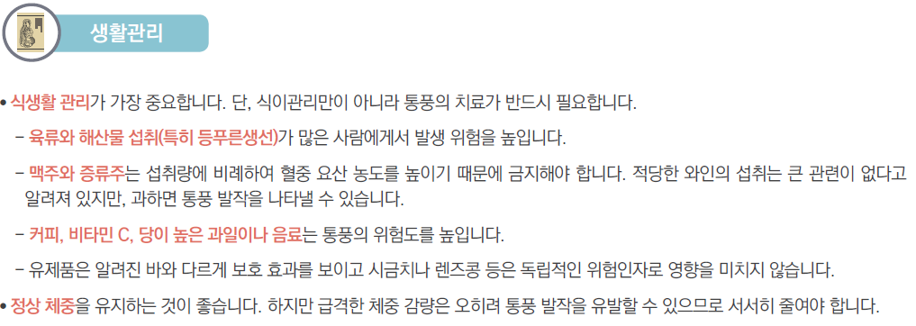 통풍은 식습관과 비만 때문에 생기는 경우가 많으므로, 식생활을 개선해야 합니다. 고단백, 고칼로리식에는 통풍성 관절염의 원인이 되는 요산을 발생시키는 퓨린이 많이 들어있으므로 주의해야 합니다. 잦은 음주, 비만, 고콜레스테롤 혈증, 당뇨, 고혈압 등이 있는지 확인하고 이를 치료해야 합니다. 저퓨린 식이와 금연이 필요합니다.