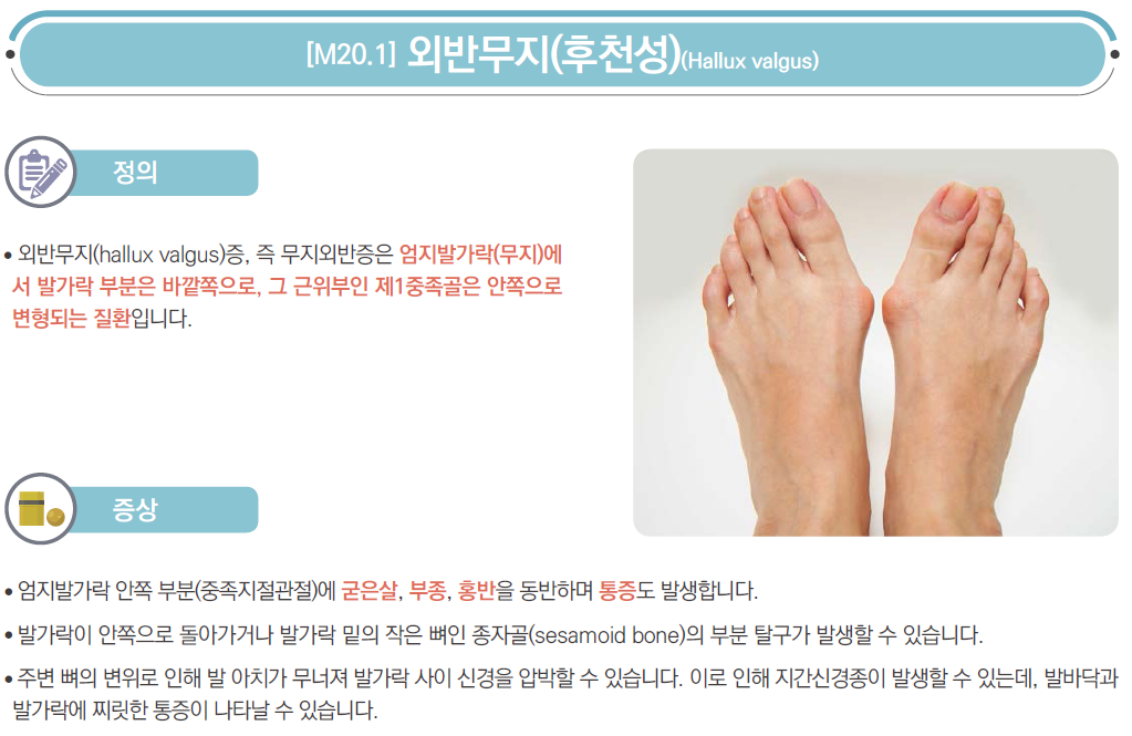 무지외반증은 엄지발가락이 둘째발가락 쪽으로 심하게 휘어져서 엄지발가락 관절이 안쪽으로 돌출된 상태를 의미합니다. 이 증상이 심할 경우, 엄지발가락이 둘째발가락과 엇갈리는 정도까지 돌아가기도 합니다. 특히 앞이 좁고 굽이 높은 신발을 자주 신는 여성에게 잘 발생하는 족부 질환입니다.