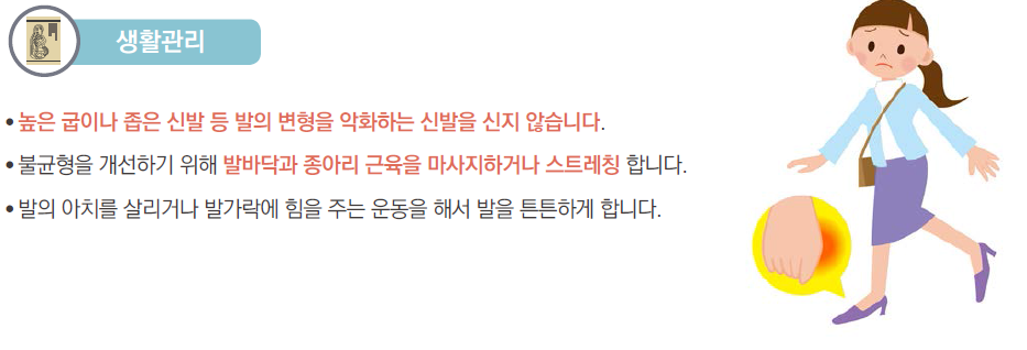 무지외반증이 심하지 않은 경우, 증상을 조절하고 변형의 진행을 늦추기 위해서 볼이 넓고 부드러운 신발을 착용하거나, 교정을 위한 깔창이나 보형물을 사용합니다.
