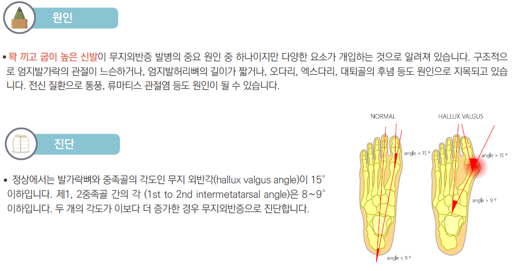 무지외반증은 엄지발가락이 둘째발가락 쪽으로 심하게 휘어져서 엄지발가락 관절이 안쪽으로 돌출된 상태를 의미합니다. 이 증상이 심할 경우, 엄지발가락이 둘째발가락과 엇갈리는 정도까지 돌아가기도 합니다. 특히 앞이 좁고 굽이 높은 신발을 자주 신는 여성에게 잘 발생하는 족부 질환입니다.