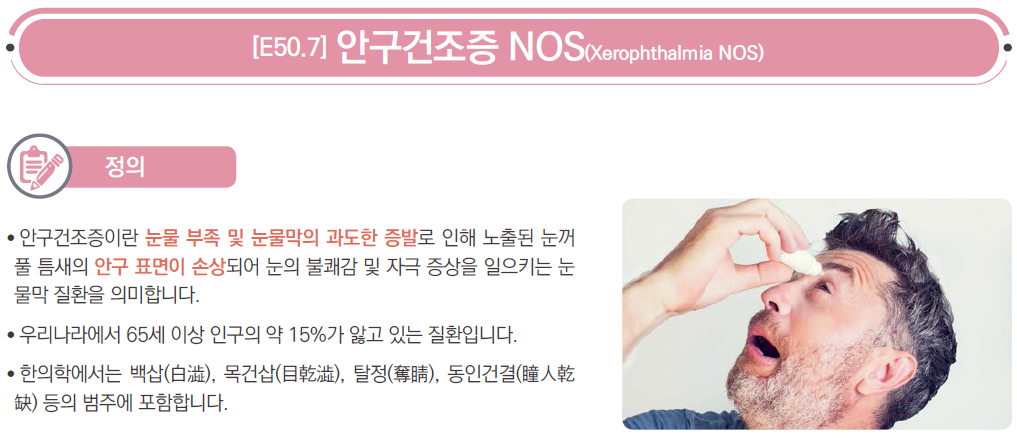 안구 건조증은 눈물의 분비가 줄어들거나, 눈물은 많이 분비되더라도 그 성분에 변화가 생김으로써 안구 건조 등 여러 가지 증상이 나타나는 상태를 의미합니다. 눈물은 세 층으로 이루어져 있습니다. 가장 안쪽 층은 점액층으로, 수성층이 고르게 펴지게 하는 역할을 합니다. 중간층은 수성층으로, 눈물층의 대부분을 형성합니다. 눈을 촉촉하게 유지하고, 눈에서 이물질을 제거합니다. 가장 바깥층은 지방층으로, 수성층의 증발을 막는 역할을 합니다. 나이가 들거나, 눈물을 분비하는 데 관여하는 눈 구조물들에 염증, 외상 등의 손상이 생기면 안구 건조증이 발생할 수 있습니다.