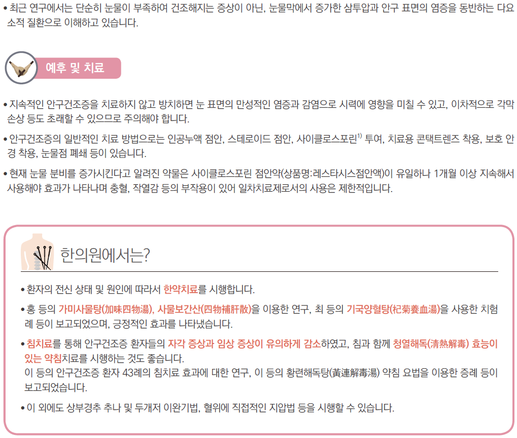 환경 요인에 신경 써야 합니다. 먼지가 많은 작업장을 피하는 것이 좋습니다. 건조한 곳에는 가습기를 틀어서 공기를 습하게 만들어 주는 것이 효과적입니다. 장시간 독서나 운전, 컴퓨터 작업을 할 때는 자주 눈을 깜박이거나 휴식을 취하는 것이 좋습니다. 알레르기성 결막염, 안검염 등이 동반되었을 때에는 이에 대한 치료를 병행하여야 합니다.