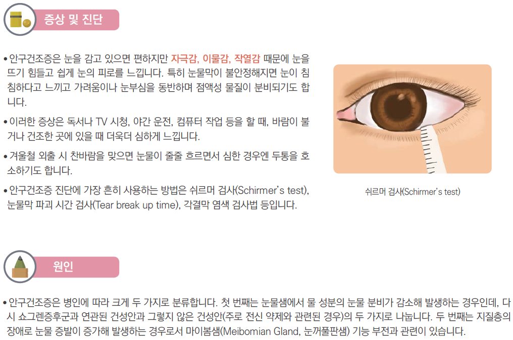 안구 건조증은 눈물의 분비가 줄어들거나, 눈물은 많이 분비되더라도 그 성분에 변화가 생김으로써 안구 건조 등 여러 가지 증상이 나타나는 상태를 의미합니다. 눈물은 세 층으로 이루어져 있습니다. 가장 안쪽 층은 점액층으로, 수성층이 고르게 펴지게 하는 역할을 합니다. 중간층은 수성층으로, 눈물층의 대부분을 형성합니다. 눈을 촉촉하게 유지하고, 눈에서 이물질을 제거합니다. 가장 바깥층은 지방층으로, 수성층의 증발을 막는 역할을 합니다. 나이가 들거나, 눈물을 분비하는 데 관여하는 눈 구조물들에 염증, 외상 등의 손상이 생기면 안구 건조증이 발생할 수 있습니다.