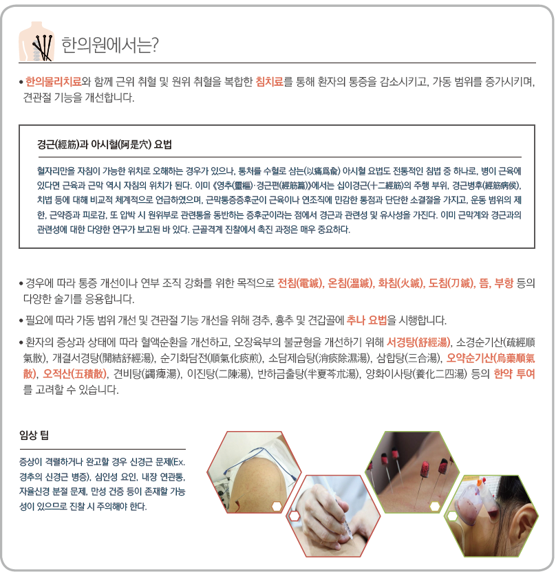 무엇보다 휴식이 중요합니다. 긴장된 근육을 가볍게 스트레칭해주고 따뜻하게 해주는 것도 도움이 많이 됩니다. 또한 통증유발점이 생기면 그 부분에 적절한 치료를 해줘서 통증이 빠르게 사라지도록 할 수 있습니다. 통증유발점에 침, 약침 등을 이용해서 치료를 해주게 되면 근육 긴장이 더 빠르게 해소됩니다. 침, 약침으로 자극을 해주고 스트레칭을 같이 하게 되면 더욱더 시너지 효과가 납니다.