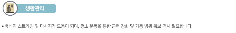 무엇보다 휴식이 중요합니다. 긴장된 근육을 가볍게 스트레칭해주고 따뜻하게 해주는 것도 도움이 많이 됩니다. 또한 통증유발점이 생기면 그 부분에 적절한 치료를 해줘서 통증이 빠르게 사라지도록 할 수 있습니다. 통증유발점에 침, 약침 등을 이용해서 치료를 해주게 되면 근육 긴장이 더 빠르게 해소됩니다. 침, 약침으로 자극을 해주고 스트레칭을 같이 하게 되면 더욱더 시너지 효과가 납니다.