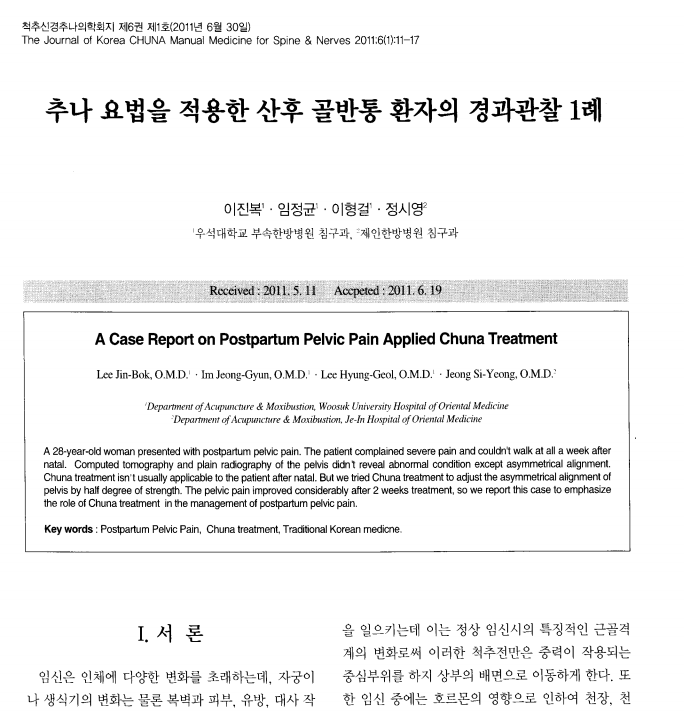 10년 전에 제가 쓴 추나 치료를 통한 산후 골반통을 치료하고 보고한 논문입니다.