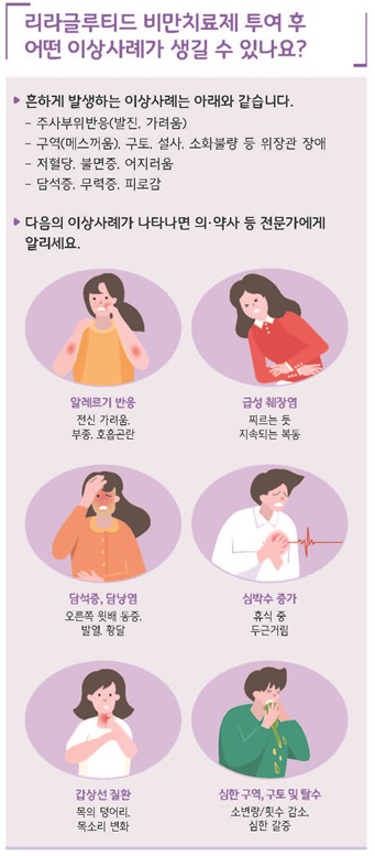 이와 함께 리라글루티드 비만치료제 투여 후 발생할 수 있는 이상사례로는 가장 흔하게 주사부위반응(발진·가려움 등), 구역, 구토 등 위장관 장애, 저혈당, 불면증, 어지러움 등이 나타날 수 있다. 또 알레르기 반응이나 급성 췌장염, 담석증 및 담낭염, 심박수 증가, 갑상선 이상, 심한 구역, 구토 및 탈수가 발생하는 경우에는 즉시 전문가와 상담해야 한다.