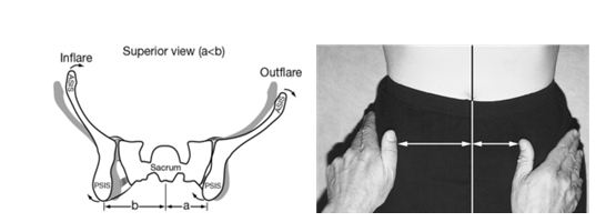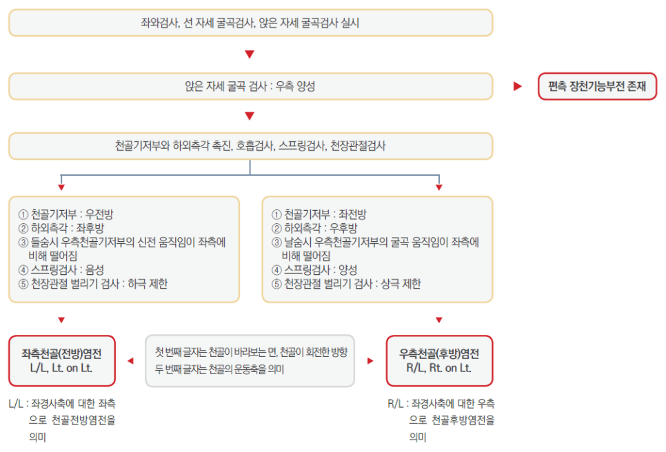 골반의 변위에 대해서 좌와(座位) 검사, 선 자세 굴곡 검사, 앉은 자세 굴곡 검사를 통해 장골 기능 부전 또는 천장 기능 부전을 진단합니다. 또한 복와위 상태에서 기능적 족지 장단 분석을 하여 골반 자세 이상을 진단하고 치료하는 경우도 있습니다.