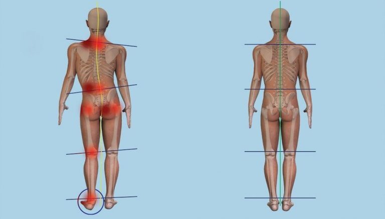 좌측의 경우 발목의 외번(eversion)이 연쇄적으로 좌측 슬관절, 고관절, 요방형근, 어깨근육의 불균형을 야기하고 있다. 이러한 발의 외반을 일으키는 대표적인 것으로는 첫번째 발가락 중족골이 두번째 발가락의 중족골 보다 과도하게 짧은 Morton foot structure를 꼽을 수 있다.