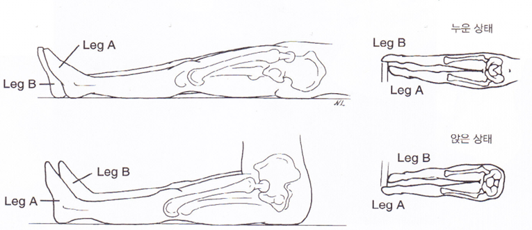 | ○ 좌와검사 결과의 해석 와위 시 단족 → 좌위 시 장족 또는 다른 쪽과 같아짐 : 장골후방회전 와외 시 장족 → 좌위 시 단족 또는 다른 쪽과 같아짐 : 장골전방회전 해부학적 단족이 있다면 와외, 좌위 모두에서 계속 짧다. |