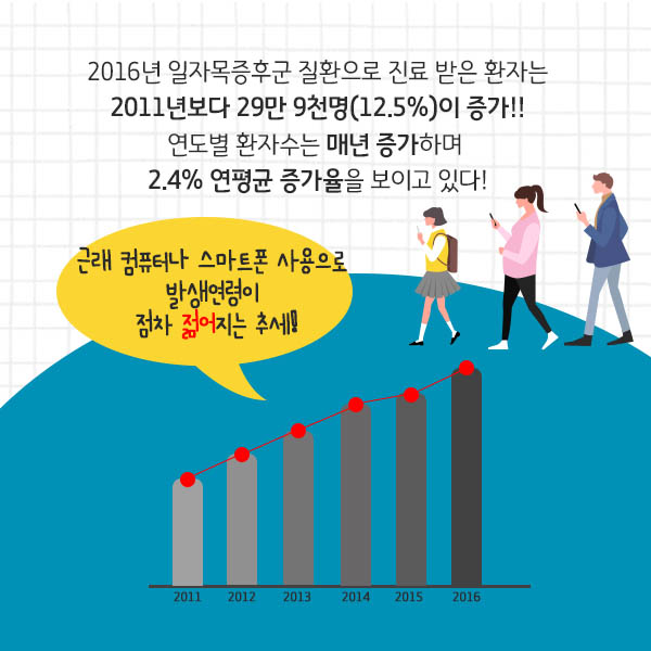 현대인들의 스마트폰 사용이 과도해지면서, 목이 거북목 양상이 되어 그렇습니다.