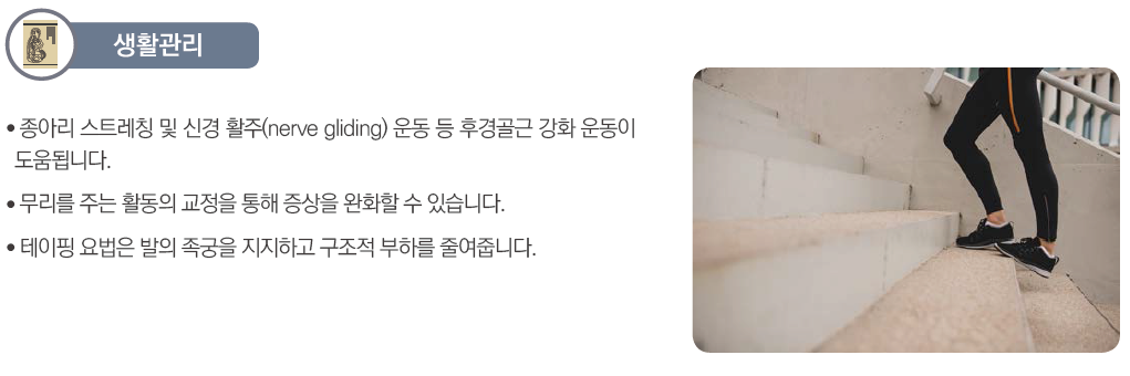 발목터널증후군을 예방하려면 발목을 무리하게 사용하는 운동은 자제하는 것이 좋습니다. 또한 갑작스러운 운동에 근육이 긴장해 발목 신경을 압박할 수 있어 운동의 강도를 천천히 높여주고, 운동 전 충분히 스트레칭을 해야 합니다. 또한 발목에 체중이 과하게 실리지 않도록 과체중, 비만을 예방하고 발목 안쪽으로 자극이 되지 않는 신발을 신어야 합니다. 발목터널증후군은 찜질이나 휴식을 통해서 완화되는 경우도 있지만 계속해서 방치할 경우 신체의 전체 균형을 무너뜨릴 수 있습니다. 초기에 증상을 확인하고 빠르게 치료받는 것이 좋습니다.