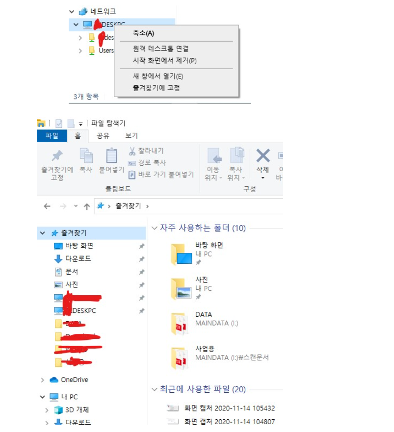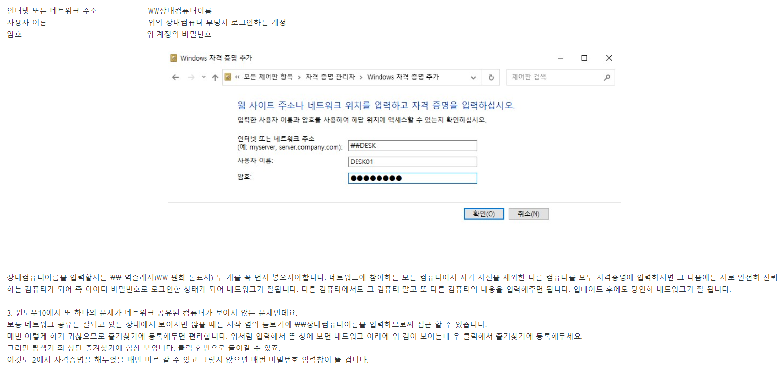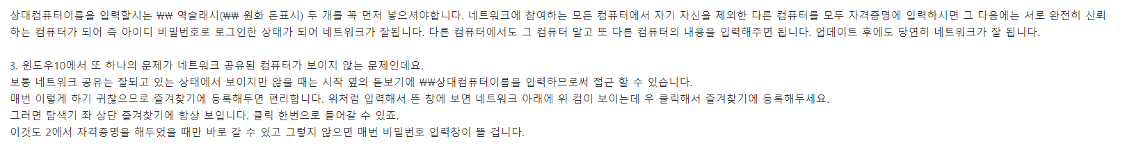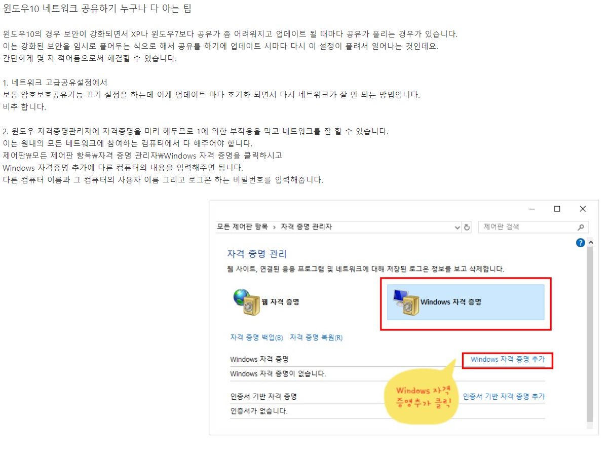 | 윈도우10 네트워크 공유하기 누구나 다 아는 팁 윈도우10의 경우 보안이 강화되면서 XP나 윈도우7보다 공유가 좀 어려워지고 업데이트 될 때마다 공유가 풀리는 경우가 있습니다. 이는 강화된 보안을 임시로 풀어두는 식으로 해서 공유를 하기에 업데이트 시마다 다시 이 설정이 풀려서 일어나는 것인데요. 간단하게 몇 자 적어둠으로써 해결할 수 있습니다. 1. 네트워크 고급공유설정에서 보통 암호보호공유기능 끄기 설정을 하는데 이게 업데이트 마다 초기화 되면서 다시 네트워크가 잘 안 되는 방법입니다. 비추 합니다. 2. 윈도우 자격증명관리자에 자격증명을 미리 해두므로 1에 의한 부작용을 막고 네트워크를 잘 할 수 있습니다. 이는 원내의 모든 네트워크에 참여하는 컴퓨터에서 다 해주어야 합니다. 제어판\모든 제어판 항목\자격 증명 관리자\Windows 자격 증명을 클릭하시고 Windows 자격증명 추가에 다른 컴퓨터의 내용을 입력해주면 됩니다. 다른 컴퓨터 이름과 그 컴퓨터의 사용자 이름 그리고 로그온 하는 비밀번호를 입력해줍니다. 인터넷 또는 네트워크 주소 \\상대컴퓨터이름 사용자 이름 위의 상대컴퓨터 부팅시 로그인하는 계정 암호 위 계정의 비밀번호 상대컴퓨터이름을 입력할시는 \\ 역슬래시(₩₩ 원화 돈표시) 두 개를 꼭 먼저 넣으셔야합니다. 네트워크에 참여하는 모든 컴퓨터에서 자기 자신을 제외한 다른 컴퓨터를 모두 자격증명에 입력하시면 그 다음에는 서로 완전히 신뢰하는 컴퓨터가 되어 즉 아이디 비밀번호로 로그인한 상태가 되어 네트워크가 잘됩니다. 다른 컴퓨터에서도 그 컴퓨터 말고 또 다른 컴퓨터의 내용을 입력해주면 됩니다. 업데이트 후에도 당연히 네트워크가 잘 됩니다. 3. 윈도우10에서 또 하나의 문제가 네트워크 공유된 컴퓨터가 보이지 않는 문제인데요. 보통 네트워크 공유는 잘되고 있는 상태에서 보이지만 않을 때는 시작 옆의 돋보기에 \\상대컴퓨터이름을 입력하므로써 접근 할 수 있습니다. 매번 이렇게 하기 귀찮으므로 즐겨찾기에 등록해두면 편리합니다. 위처럼 입력해서 뜬 창에 보면 네트워크 아래에 위 컴이 보이는데 우 클릭해서 즐겨찾기에 등록해두세요. 그러면 탐색기 좌 상단 즐겨찾기에 항상 보입니다. 클릭 한번으로 들어갈 수 있죠. 이것도 2에서 자격증명을 해두었을 때만 바로 갈 수 있고 그렇지 않으면 매번 비밀번호 입력창이 뜰 겁니다. |