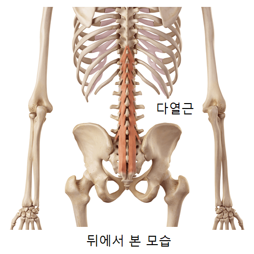 배근육 중 가장 깊은 층에 위치하며 위쪽, 중간, 아래쪽 근섬유들이 등허리근막에 넓은 범위에 걸쳐 수평 방향으로 부착하여 수축시 등허리근막의 장력을 증가시키고 허리를 둘러싼 원통모양의 부목처럼 배 안을 압박하면서 허리를 안정화시켜, 코르셋 근육이라고도 알려져 있습니다.