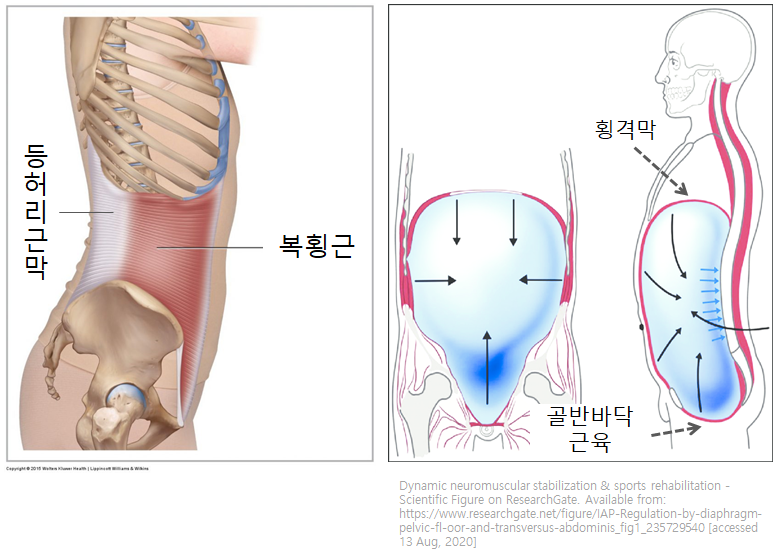 특히 중간섬유들은 양쪽으로 수축할 때, 배 안을 압박하여 복압을 증가시키는데 효율적입니다. 이러한 압력 상승은 허리에 대해 약간의 신전 토크를 발생시키면서 뻣뻣함을 증가시켜 안정화를 유도합니다. 추가적으로 배가 원통형이라고 가정할 때, 위쪽과 아래쪽도 동시에 압박이 되어야 가장 안정적이게 됩니다. 위쪽으로는 지붕 역할을 하는 횡격막 (diaphragm)이 활성화되면서 하강, 아래쪽으로는 바닥 역할을 하는 골반 바닥 근육 (골반기저근, pelvic floor muscle)이 활성화되면서 상승이 동시에 수행될 때 이루어집니다.