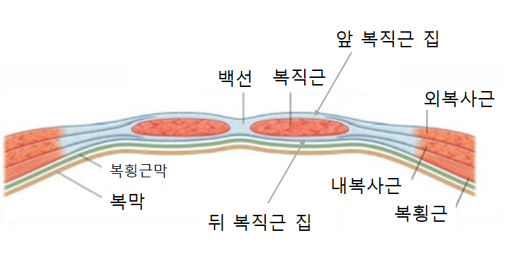몸통의 오른쪽과 왼쪽에 있는 각각의 배 근육들은 결합조직과 연결되어 배의 중앙부분에서 융합하여 앞 & 뒤 복직근 집 (anterior & posterior recuts sheath)을 형성합니다.