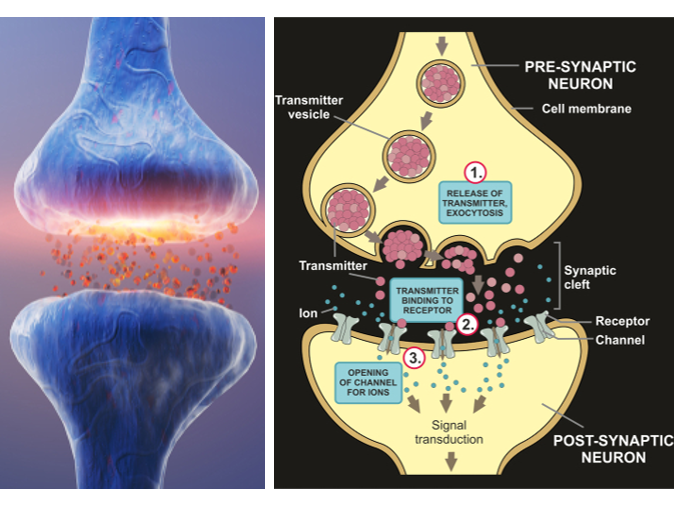 신경전달 물질이 시냅스 전신경종말에서 분비되면 시냅스 후막에 존재하는 수용체에 결합하여 정보를 전달하게 됩니다. 시냅스 간극(synaptic cleft)에 남은 신경전달물질은 시냅스 전신경종말의 트렌스포터를 통해 재흡수됩니다.