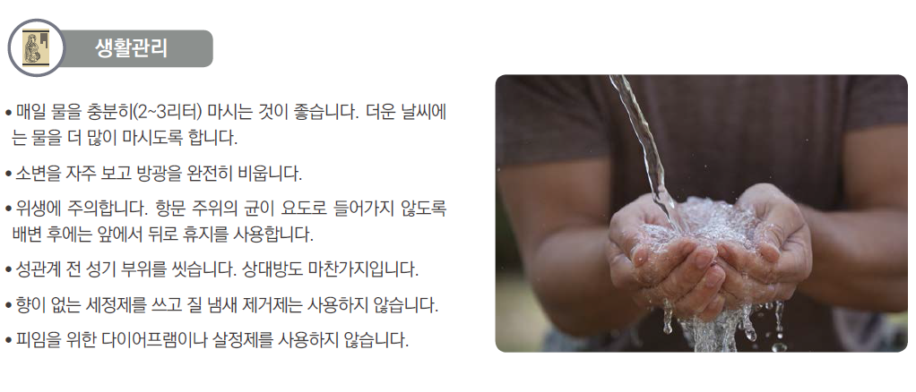 이러한 증상을 완화하기 위해서는 앞서 설명드린 것처럼 수분을 충분히 보충하는 것이 되겠습니다. 수분을 보충함으로써 소변과 함께 세균을 밖으로 배출하는 것이죠.
