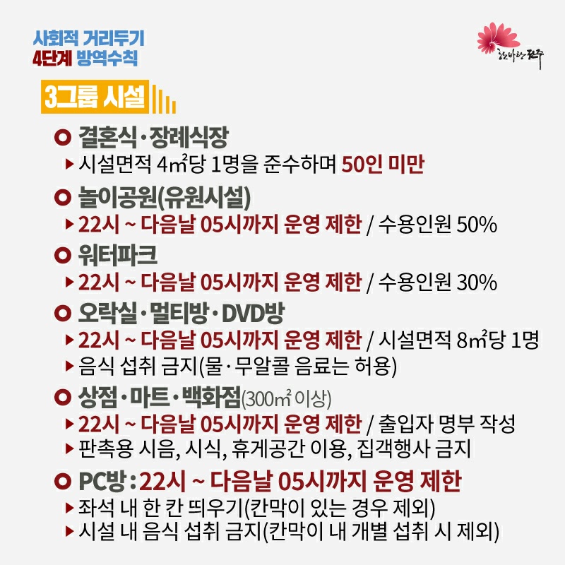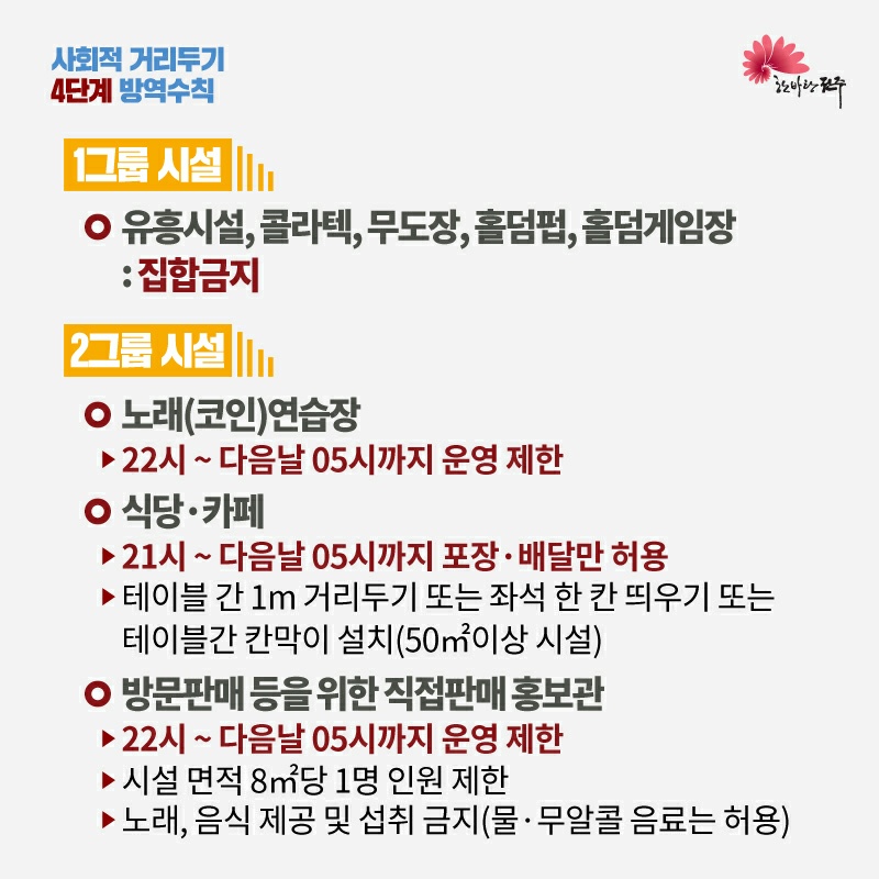 전주시에도 코로나 확진자가 늘어남에 따라 8월 27일부터 2주간 사회적 거리두기 4단계를 실시하네요.
