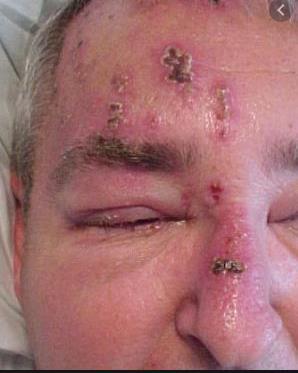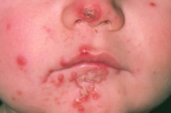 위의 사진은 피부에 생기는 농가진(impetigo)이다. 이것은 포도상 구균 감염에 의한 감염으로서 때로는 심장에 합병증을 일으키는 등 정확한 진단을 필요로 하는 질환입니다. 대상 포진과 치료가 전연 다르죠.