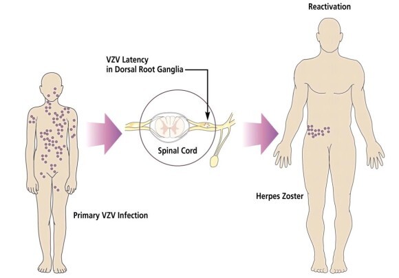 원래 대상포진 바이러스는 어릴 때에 전신에 물집이 생기는 수두(물 마마)의 원인이 된다. 이 수두는 대부분에서 별 탈이 없이 회복이 됩니다. 그러나 회복이 되고 나서 이 바이러스가 척추의 감각을 담당하는 신경다발의 뒤쪽 신경절(dorsal root ganglia) 속에 죽지 않고 숨어 있다가 가끔 이 신경을 타고 내려와서 피부에 물집을 형성하면 이것이 대상포진, 즉, 띄 모양으로 퍼지는 물집 병입니다.