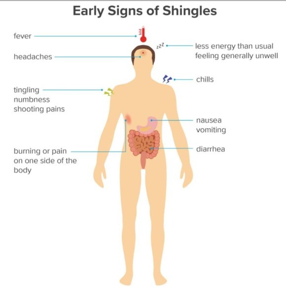 대상 포진의 전구 증상을 그림으로 표시한 것입니다. 가끔 메스껍고, 설사도 나며 토할 수도 있다고 합니다.