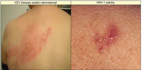 위의 사진에서 왼쪽은 대상포진이고 오른쪽은 입속에 물집이 생기기 잘하는 단순 포진(herpes simples)입니다.