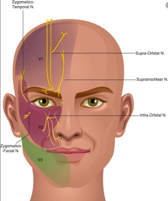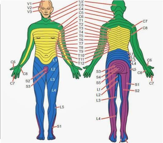 대상 포진이 나타날 때에는 감각 신경다발에서 출발하기 때문에 피부의 신경 분절(dermatome)에 따라서 포진이 나타나며 절대로 반대편 피부로 퍼지지 않는다는 것이 특징입니다. 얼굴은 척추의 감각 신경인 3차 신경이 널리 퍼져 있으므로 넓은 범위에서 발진이 생기며 특히 눈, 귀속에도 생길 수 있습니다. 위의 신경분절 표시에서 볼 수 있듯이 항문이나 성기 근처에 생기는 경우에는 다리나 배 등 다른 곳으로 퍼지지 않기 때문에 일부러 잘 관찰해야 합니다. 특히 성기에는 물집을 일으키는 성병도 있어서 감별이 필요합니다.