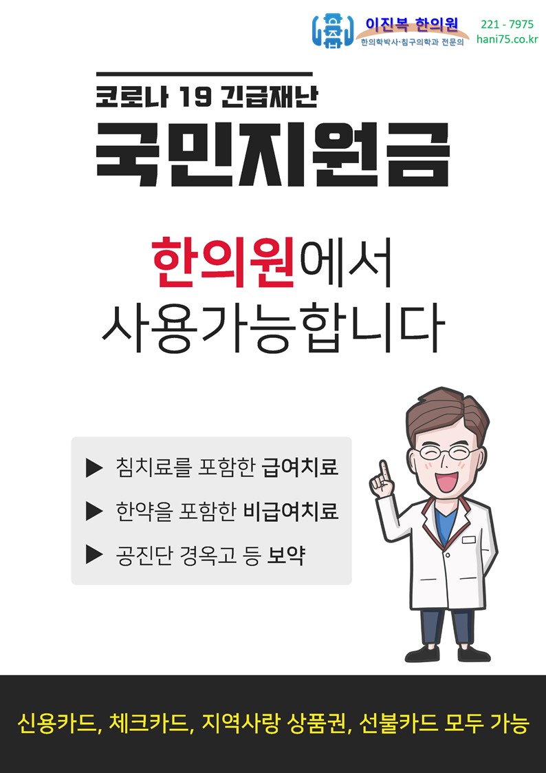 이번 국민지원금이 이진복한의원에서도 사용 가능합니다.