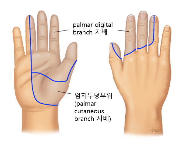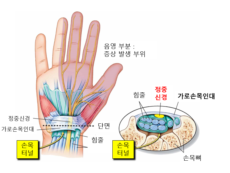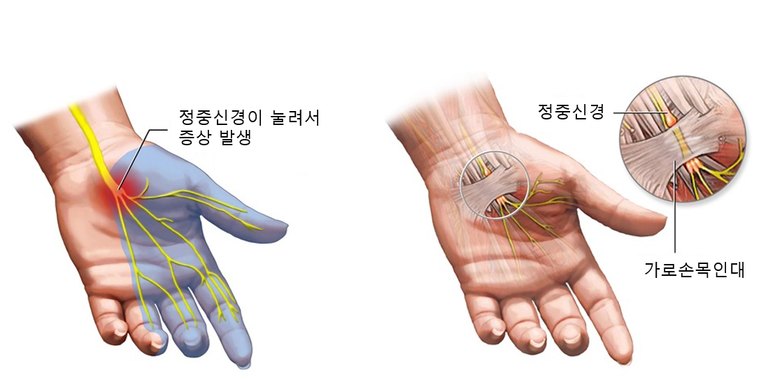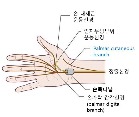 아래 그림처럼 손목 관절 부위에서 가로손목인대의 밑으로 지나가는 정중신경이 눌릴 경우, 파란색 음영으로 표시한 부분에 저림이나 통증 등이 발생합니다.