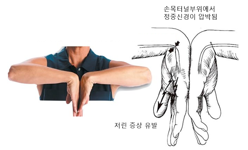 책상이나 탁자위에 팔을 두거나 앉은자세에서 양쪽 손의 손등쪽이 닿은채로 손목을 최대한 굴곡 시킵니다. 굴곡 시킨 상태를 30~60초 가량 유지합니다. 이러한 자세는 손목 터널내의 압력을 증가시켜 정중신경이 눌리는 상황을 유발하는 검사방법입니다. 저리거나 둔한감각과 같은 호소하던 증상이 재현된다면 검사 양성으로 판정합니다.