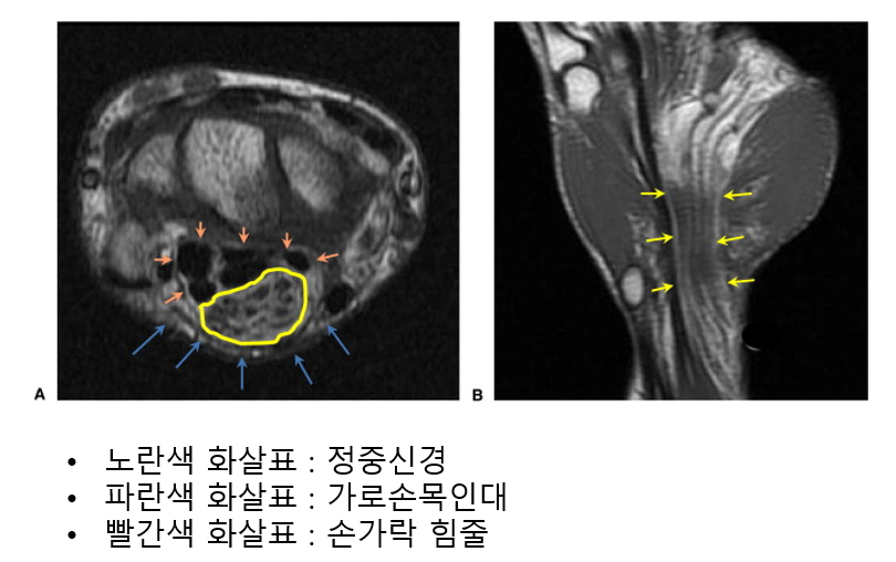 손목의 단면을 통해 좀더 살펴보면, 가로손목인대가 손목터널의 지붕 역할을 하고 손목뼈들이 손목터널의 바닥 역할을 하는 것을 알 수 있습니다. 이렇게 형성된 손목 터널의 공간으로는 정중신경을 비롯하여 손가락을 구부릴 때 사용되는 힘줄들이 통과합니다.
