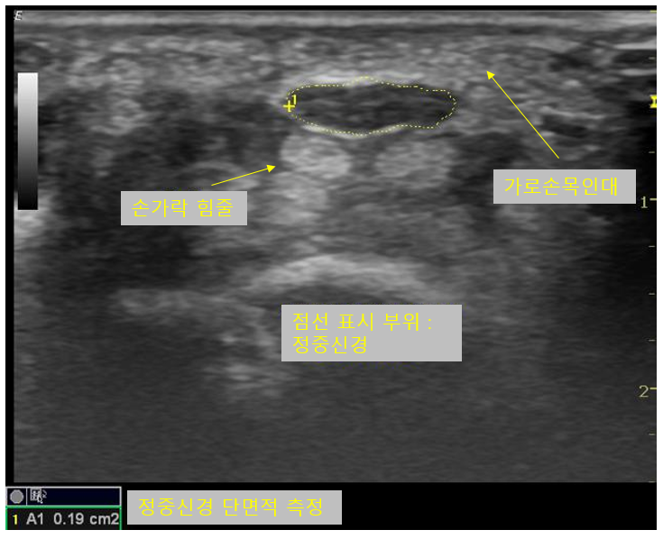 초음파 검사에서 정중신경이 눌려있을 경우 초음파음영이 감소하여 정상보다 어둡게 보이며, 흔히 신경이 벌집모양으로 보인다고 설명하는데 벌집모양이 뚜렷하게 보이지 않고 소실될 수 있습니다. 좀더 객관적으로 데이터화 하기 위해 정중신경의 단면적을 측정할 수 있습니다. 신경이 눌릴 경우엔 눌린 부위보다 근위부에선 신경의 단면적이 증가하게 됩니다. 고무풍선과 같이 탄력성 있는 물체의 한쪽 부분을 눌렀을때를 생각해보시면 이해가 쉬우실것 같습니다.