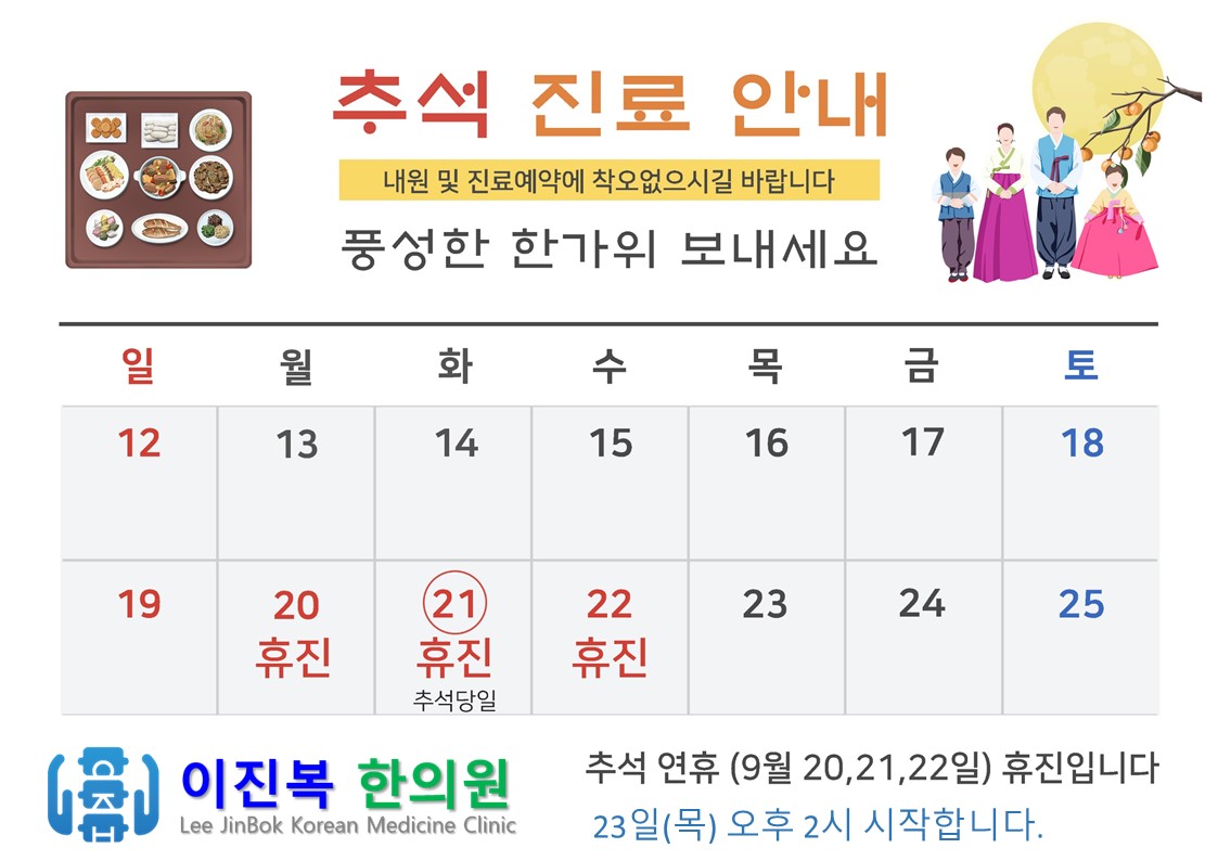 | 전주 이진복한의원 10월 연휴 진료안내 (0) | 2021.09.30 |