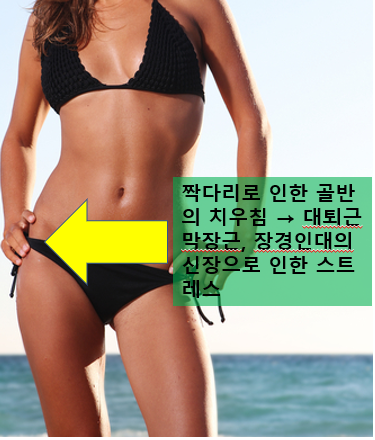 사람은 어느 정도의 다리 길이 차이가 존재합니다. 이런 차이는 짝다리로 표현되죠. 다리가 짧은 쪽으로 체중을 기울여 서는 것이 편합니다. 이는 골반을 더 틀어지게 하는 원인이 되고, 다리가 더 짧아지도록 가속화 합니다. 위 그림처럼 짝다리를 짚으면 우측 다리가 짧다고 볼 수 있습니다. 짝다리를 짚는 것과 동시에 골반은 우측으로 빠져 있는 것이 보이죠. 골반이 외측으로 빠지게 되면 외측에 있는 장경인대 뿐만 아니라 중둔근, 대퇴근막장근, 대둔근 등은 신장되면서 스트레스 상황에 놓이게 됩니다. 이로 인해 대전자 압박이 커지고 점액낭염이 나타날 수 있습니다.