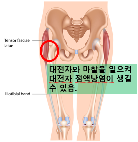 이는 대퇴근막장근이 직접적인 원인으로 보여지지는 않습니다. 대퇴근막장근은 장경인대의 중간 부분에서 합쳐지는데 근육의 벡터상 무릎 외측 통증의 원인은 될 수 있으나 위쪽인 대전자 점액낭염의 원인이 되기는 어려워 보입니다.