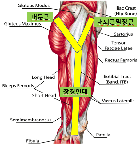 대퇴근막장근의 후외측 섬유는 장경인대에 연결됩니다. 따라서 장경인대증후군(IT band syndrome)의 주된 원인이 되죠. 위 그림과 같이 장경인대는 앞쪽으로 대퇴근막장근, 뒤쪽으로 대둔근에 연결되어 'Y'자 모양을 형성합니다. 따라서 장경인대증후군에서 대퇴근막장근, 대둔근을 함께 살펴 치료해야 합니다.