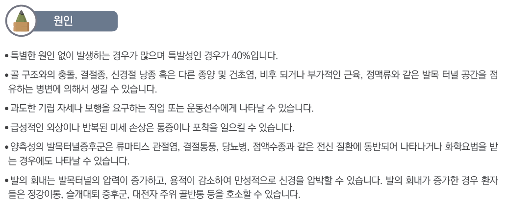 발목터널자체의 문제라면 발목터널을 덮고 있는 인대을 이완시키고, 발목터널 내부를 압박하는 요인들을 제거하고, 평발과 같은 구조적인 문제를 해결하면 증상은 빠르게 소실됩니다.
