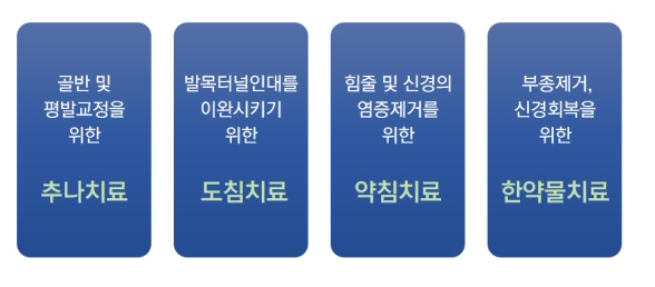 발목터널을 형성하고 있는 넓은 인대를 이완시키 위해 도침으로 인대를 부드럽게 만들고, 평발의 경우 안쪽으로 돌아가 있는(회외) 발목을 추나요법으로 바깥쪽으로 돌려주어 발목터널의 내부공간을 확보하고, 부어있는 건초염을 가라앉히기 위한 약침치료를 시행하며, 아울러 관절을 강화시키고 관절내부의 붓기를 감소시키며 손상된 신경을 재생시켜주는 한약물치료를 병행합니다.