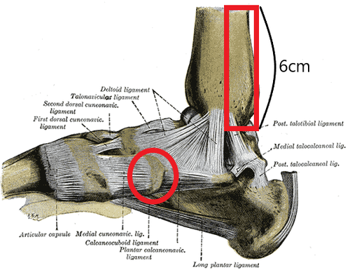 2. 안쪽 복숭아뼈에서 후면을 따라 상방으로 6cm 부위에 촉진시 통증