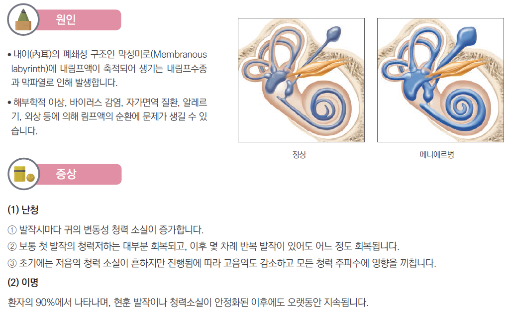 메니에르병은 회전감 있는 현기증과 청력 저하, 이명(귀울림), 이 충만감(귀가 꽉 찬 느낌) 등의 증상이 동시에 발현되는 질병으로, 1861년에 프랑스 의사 메니에르(Meniere)에 의해 처음 언급되었습니다.