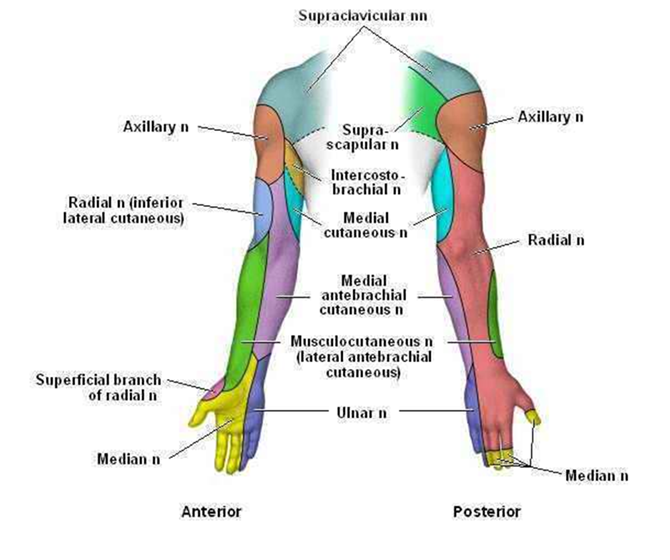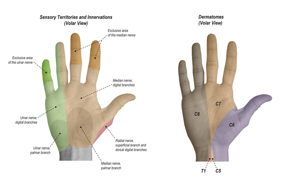 ● 척골신경은 손을 움켜쥘 때 쓰이는 근육에 관여하며, 소지구(새끼 두덩)의 내전(모음) 근육들과 뼈 사이의 내전근을 포함합니다.