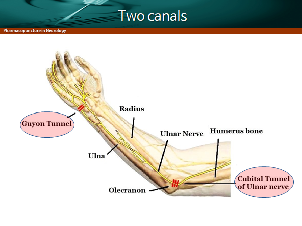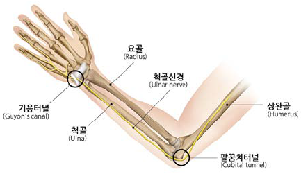 ● 척골신경이 포착(entrapment)되는 곳이 몇 곳 있는데, 가장 빈발하는 곳이 팔꿈치 터널입니다. 팔꿈치 터널에서 척골신경이 포착된 경우를 팔꿈치 터널 증후군(Cubital tunnel syndrome)이라고 합니다. 손목 부위에서는 기용터널(Guyon’s cannal)에서 신경 포착이 일어날 수 있습니다.