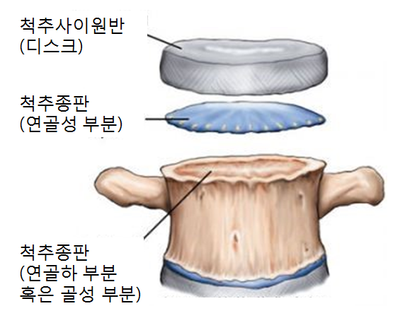 척추 몸통의 윗면과 아래면을 덮고 있는 비교적 얇은 연골성 결합조직입니다. 아동기 동안 척추뼈의 성장판으로서의 기능을 하기도 하며, 척추사이 원반과 마주하고 있는 부분은 섬유륜 내의 아교질과 직접적으로 강력하게 연결되어 있습니다.