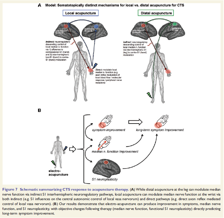 멀리 떨어진 혈자리에서 취혈하는 원위침은 뇌 일차감각영역을 조절하는 신경조절 경로를 통해 증상개선이 나타났으며 전침이 정중신경의 기능을 조절하고 S1 영역의 신경가소성을 개선시키는 효과가 있을 것이라는 가설을 제시했습니다.