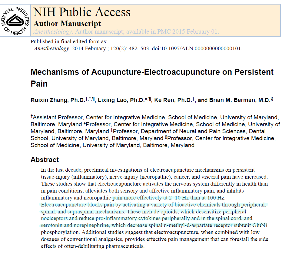 서로 다른 진동수, Hz에서 각각 다른형태의 opioid-system을 자극해 분비되는 아편 물질 수용체에 의해 각각 다른 효과를 중재합니다.