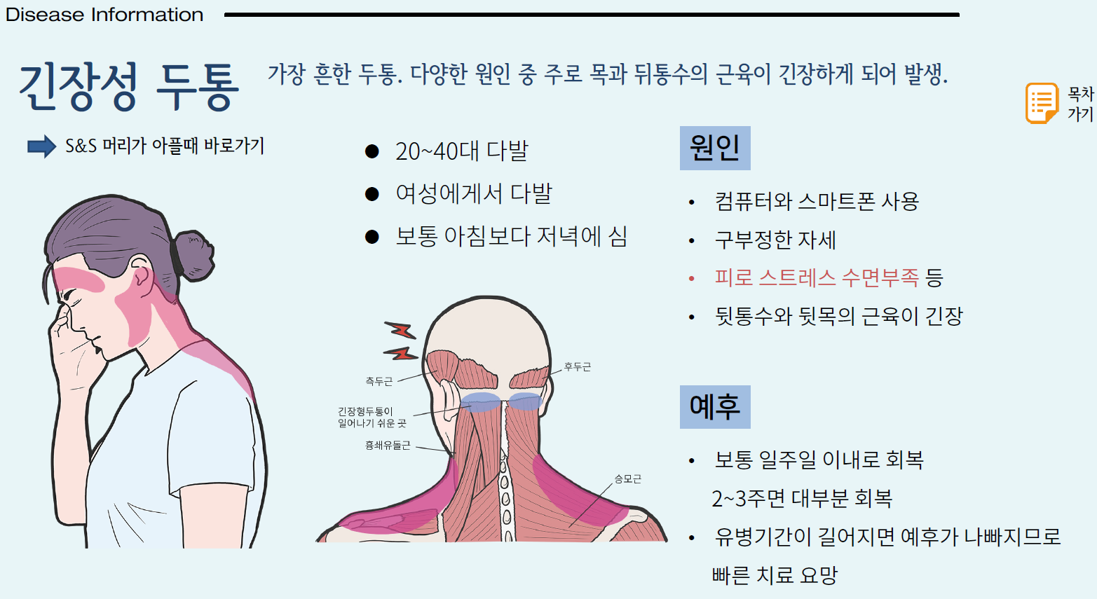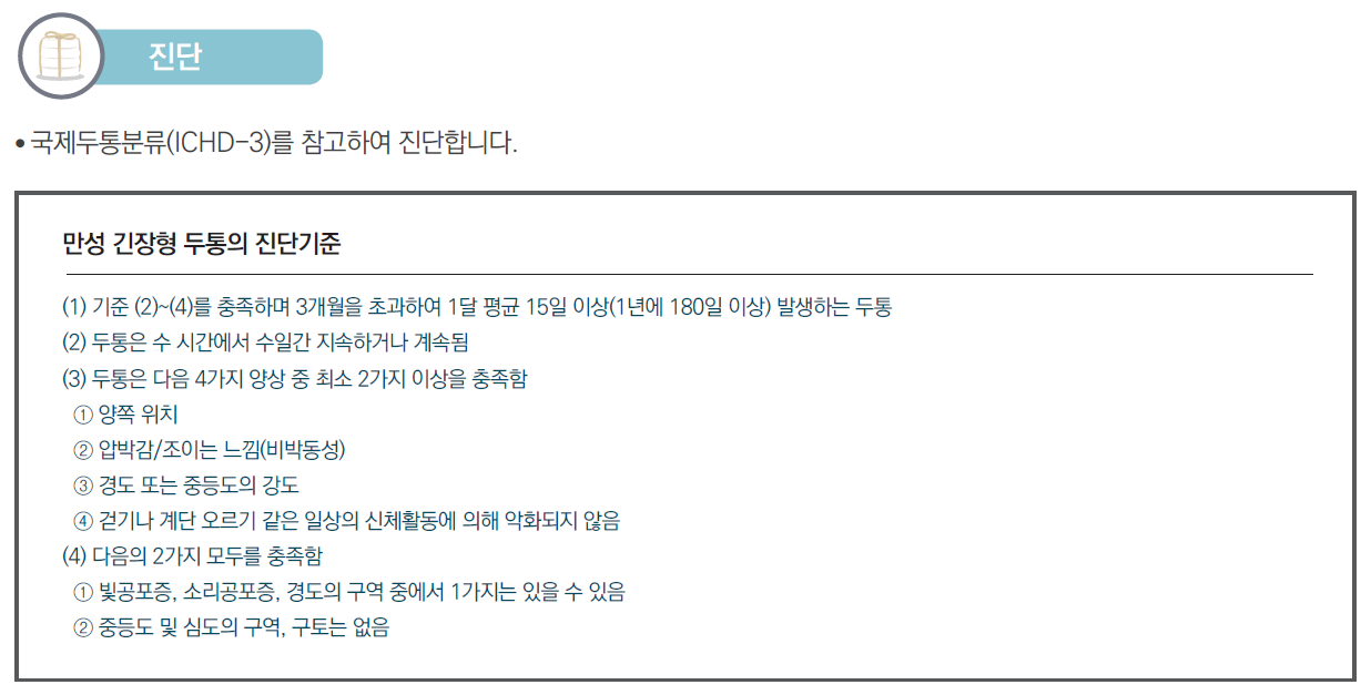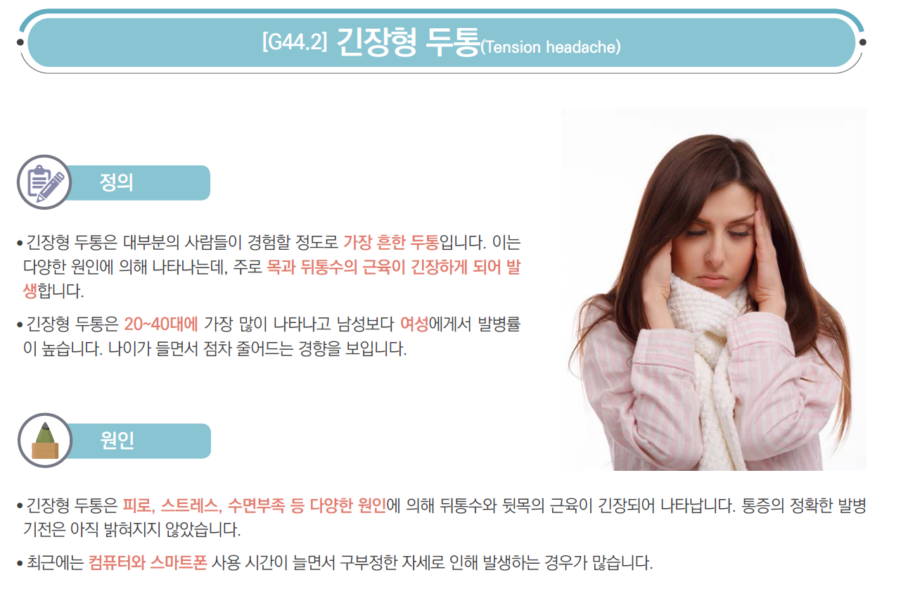 뒷머리와 뒷목에 뻐근하고 조이는 것 같은 통증이 있는 경우, 특히 통증이 오후나 저녁에 심해지고 잠자거나 쉬면 나아지는 경우 긴장형 두통을 의심할 수 있습니다. 긴장형 두통은 대부분의 사람이 생애 한번은 겪어봤을 정도로 흔한 질환입니다.