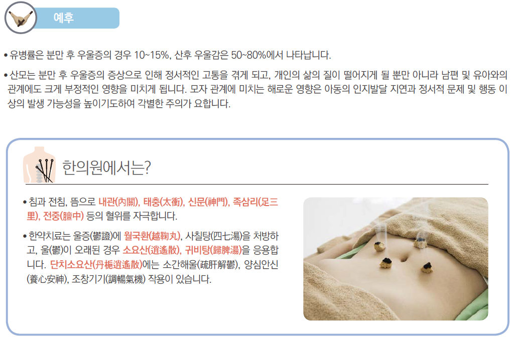 따라서, 기혈을 보하고 어혈을 제거하는 치료를 통해 심장기능을 안정시켜야 산후우울증을 치료할 수 있습니다.